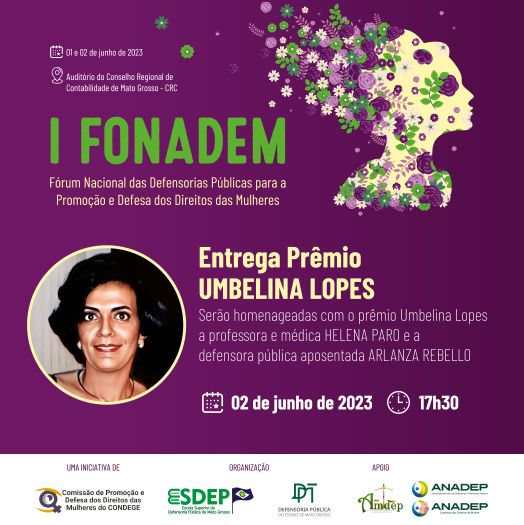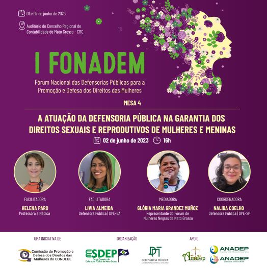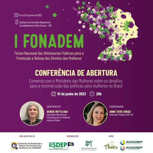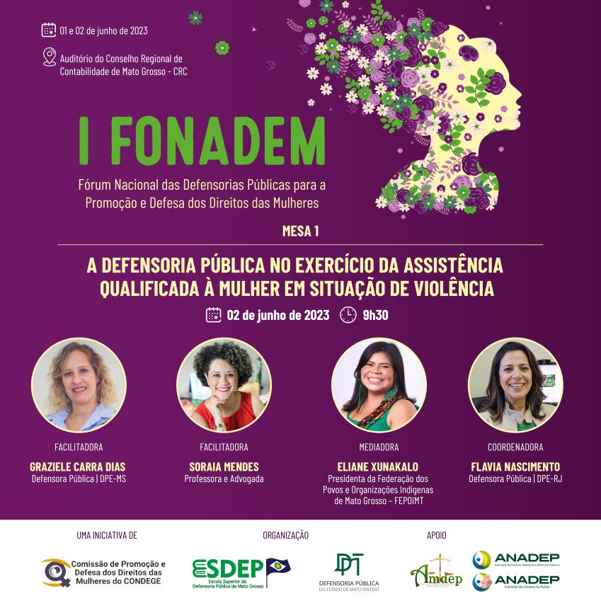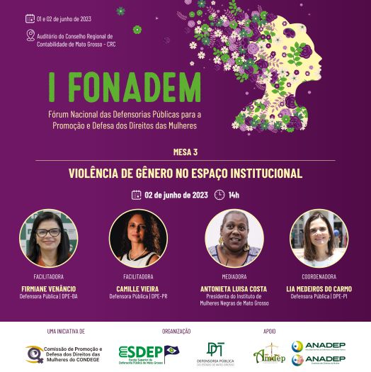 A Escola Superior da Defensoria Pública de Mato Grosso (Esdep-MT), com o apoio da DPMT, Amdep e Anadep, está organizando o 1º Fórum Nacional das Defensorias Públicas para a promoção e defesa dos direitos das mulheres (I Fonadem), que será realizado nos dias 1º e 2 de junho, em Cuiabá. As vagas são limitadas e a inscrição é gratuita (clique aqui para acessar o formulário de inscrição).