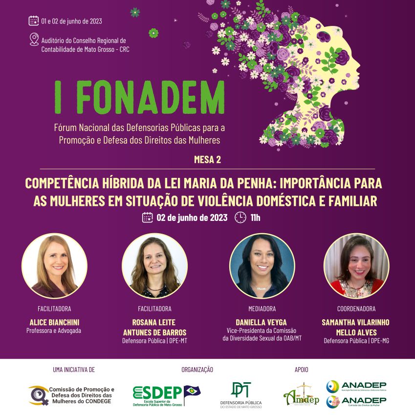 O evento, uma iniciativa da Comissão de Promoção e Defesa dos Direitos das Mulheres do Conselho Nacional das Defensoras e Defensores Públicos-Gerais (Condege), vai ocorrer no auditório do Conselho Regional de Contabilidade (CRC-MT), com transmissão online simultânea no canal da Esdep-MT no YouTube.